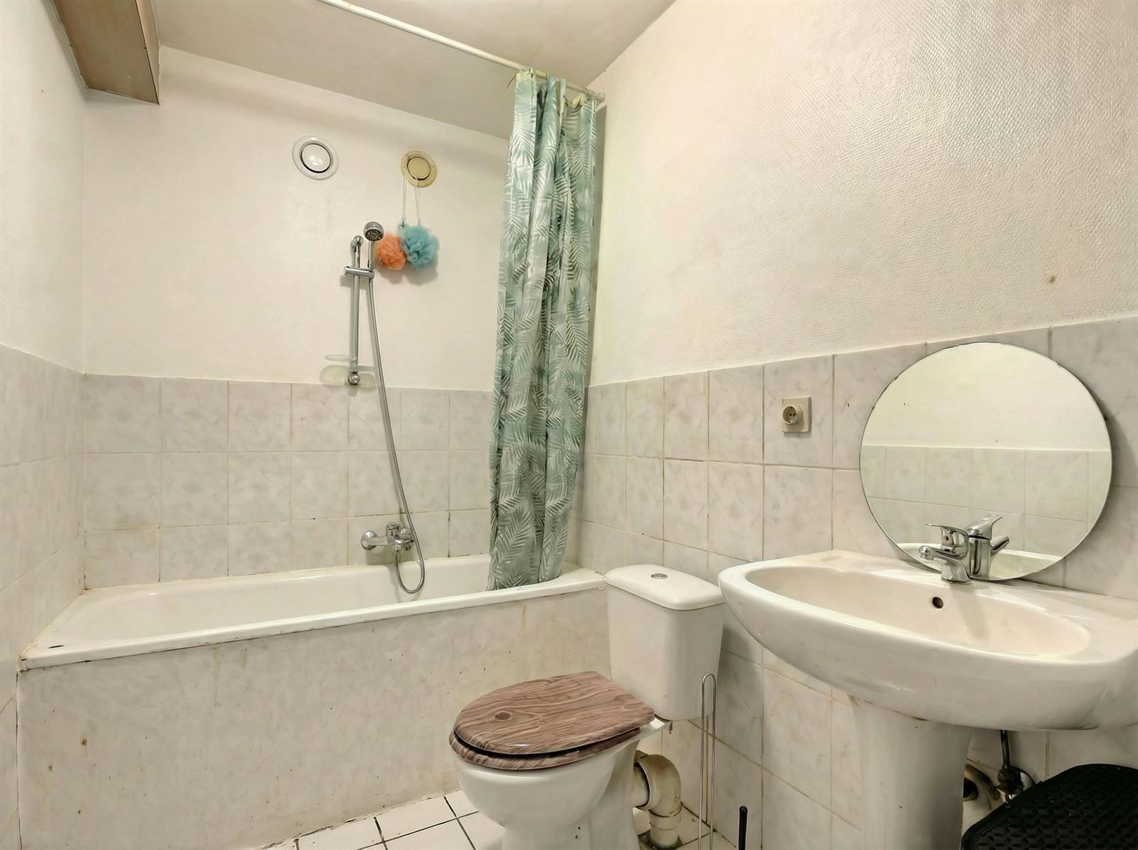 - Une salle de bains avec baignoire douche, lavabo et WC
