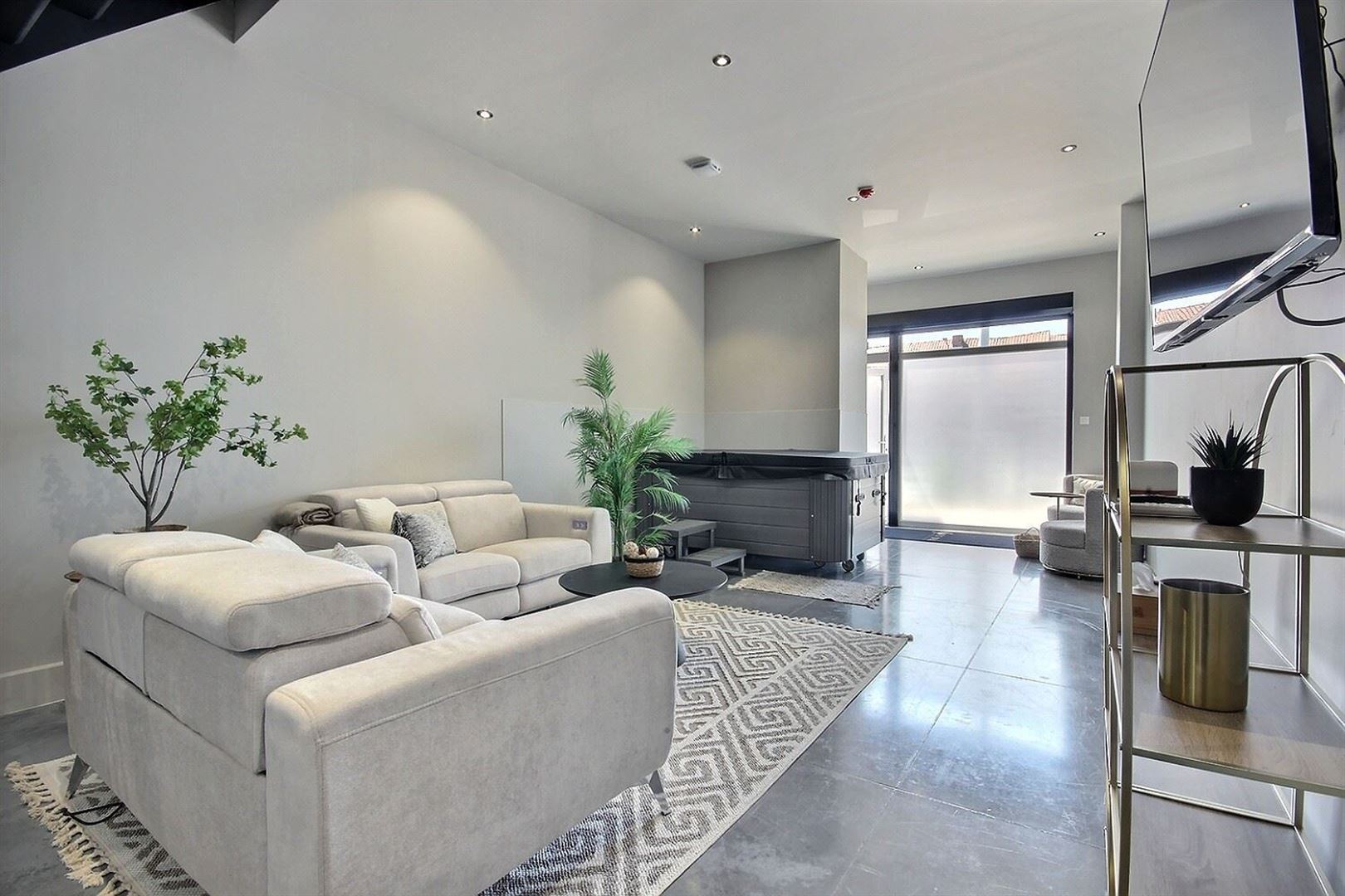 - Au rez-de-chaussée : un espace d'accueil avec vestiaire, un salon avec jaccuzzi, une salle à manger, un WC séparé et une petite cuisine équipée.