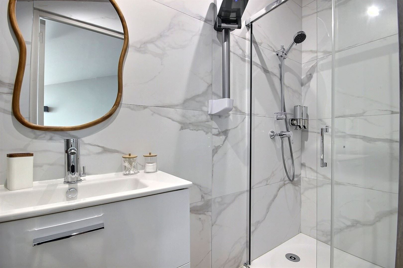 - À l'étage : une chambre confortable et une salle de bains (wc suspendu, meuble vasque, sèche serviette et douche)