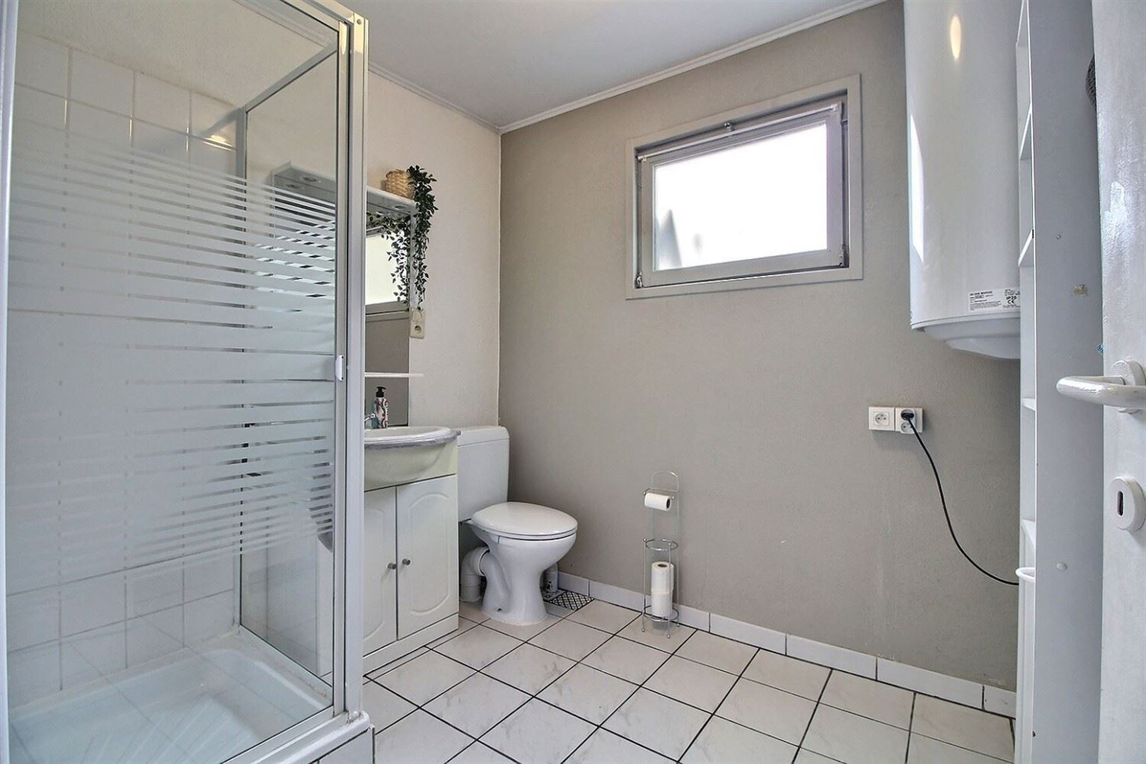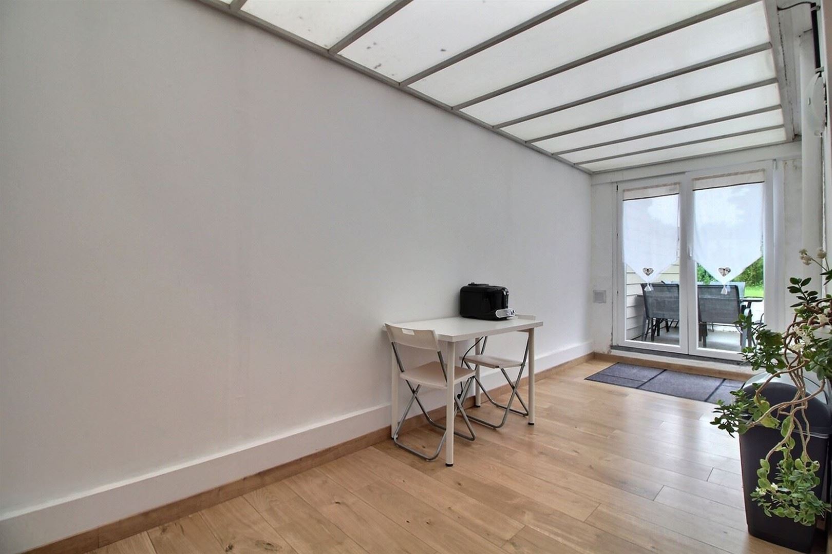 Hall d'entrée, un salon, une salle à manger avec convecteur au Gaz, une cuisine (vitrocéramique, four, hotte, évier), une salle de bain avec douche et wc ainsi qu'une véranda.