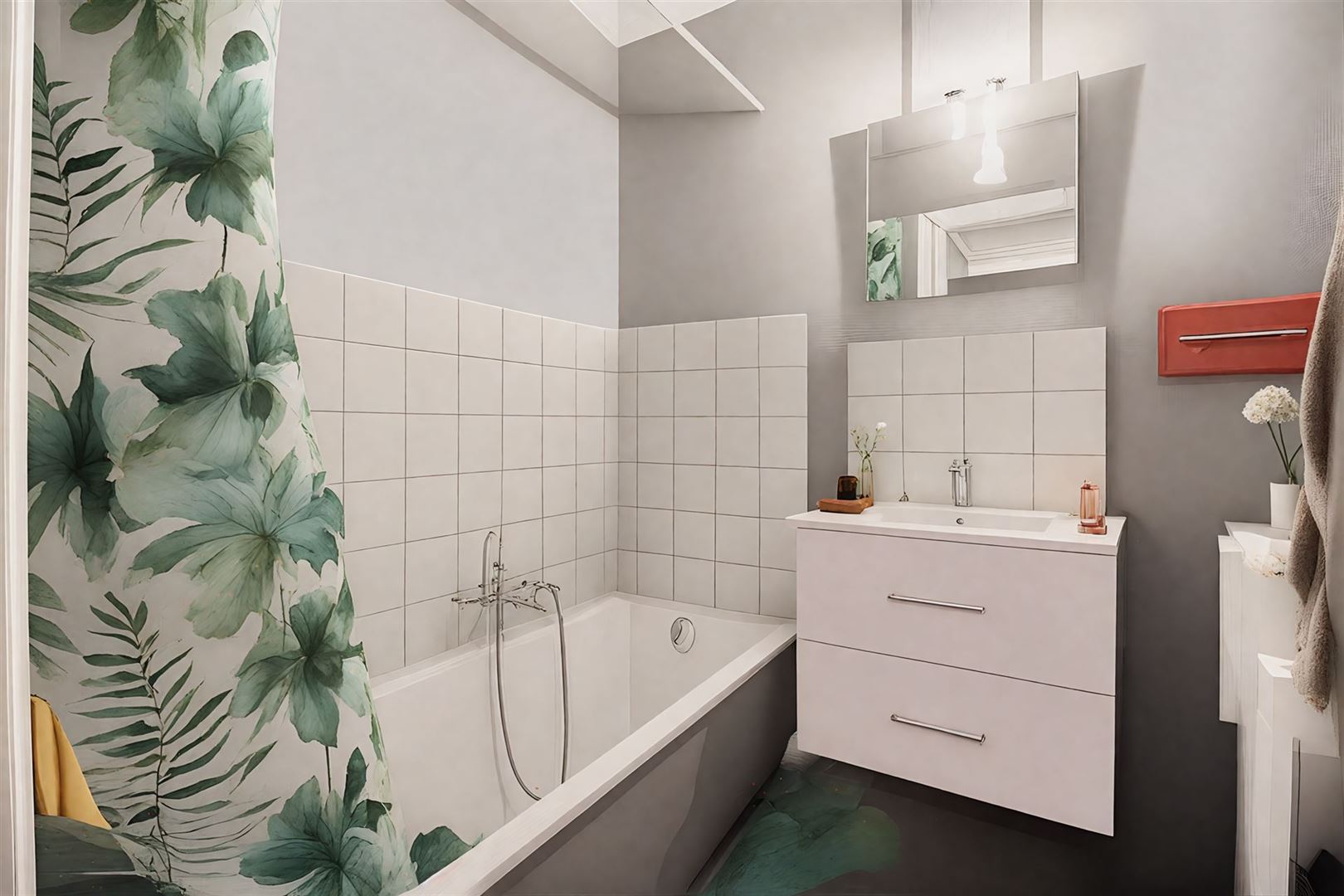 d'un Hall d'entrée avec rangements intégrés, un séjour de +/-25m², une cuisine semi-équipée, une salle de bain (baignoire, WC, coin laverie, lavabo), une chambre et un balcon.