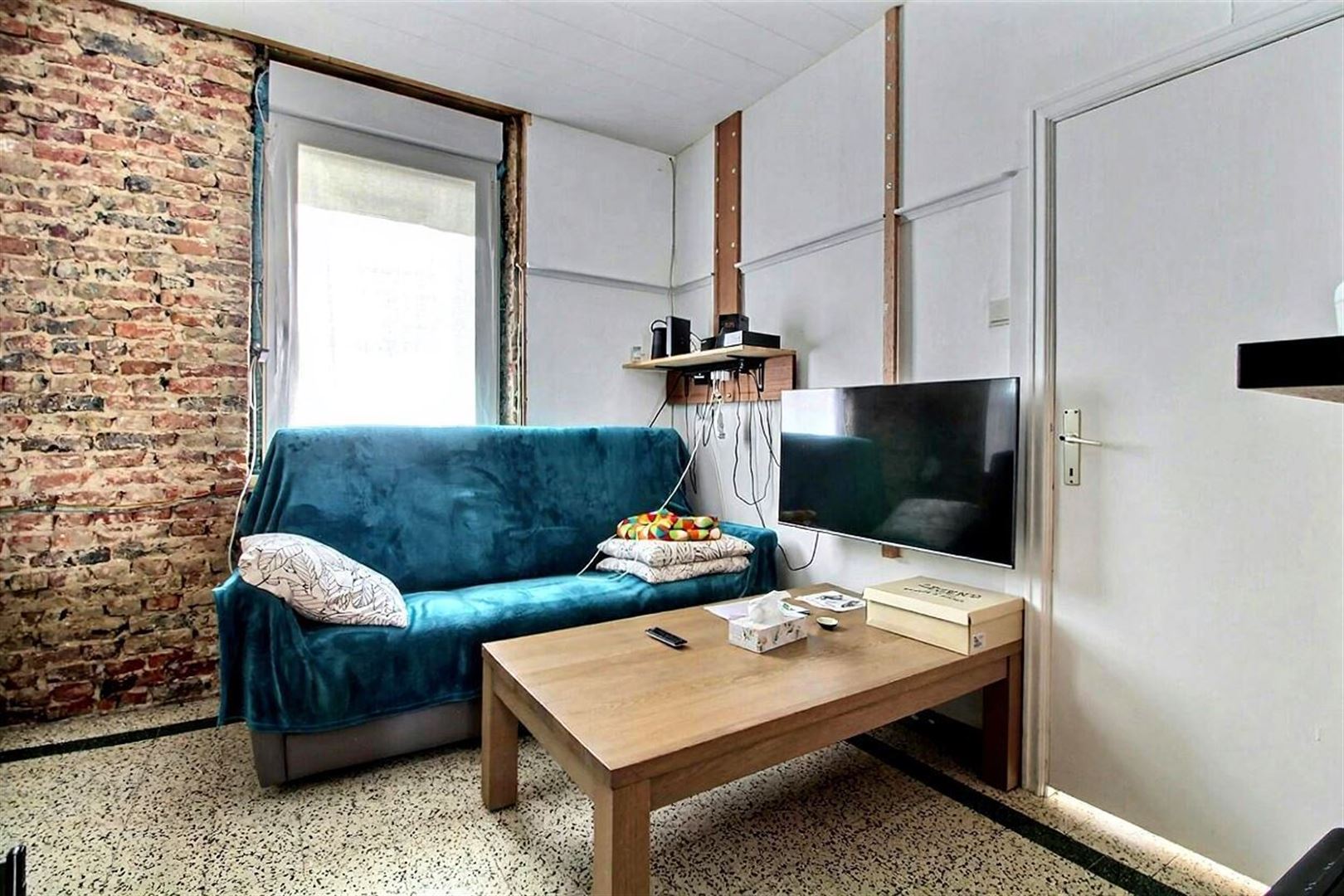 Un hall d'entrée, un living très lumineux , un espace cuisine, un espace salle de bain (douche et WC), ainsi qu'une grande cave.