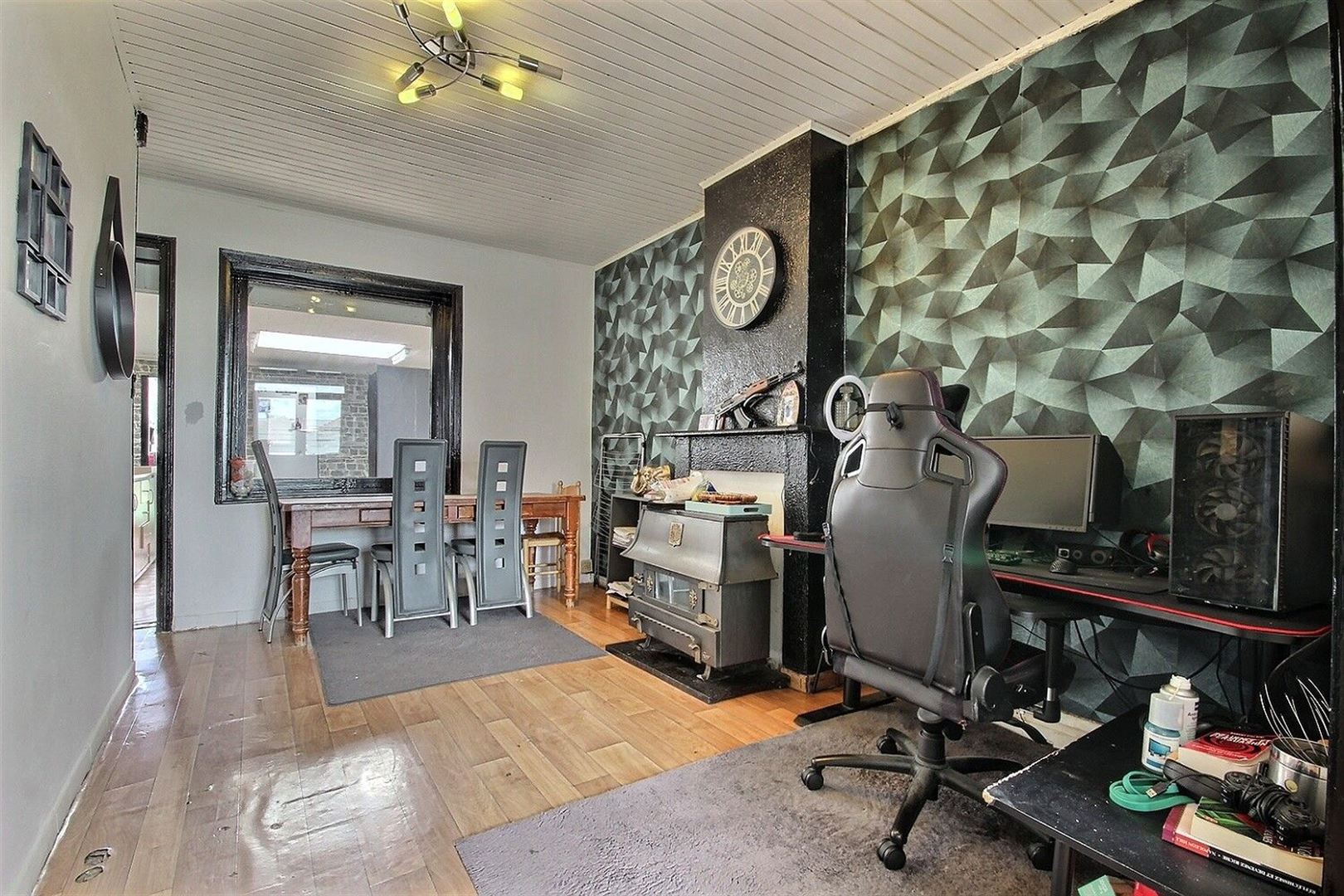 Un petit hall d'entrée vous accueille et mène vers un salon chaleureux, en enfilade avec la salle à manger. À l'arrière, un espace secondaire regroupe la cuisine, la salle de bain (baignoire, WC, buanderie) ainsi qu'un accès direct au jardin, idéal pour profiter des beaux jours.